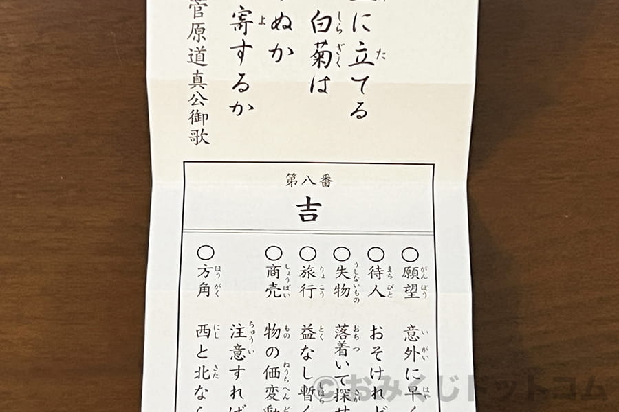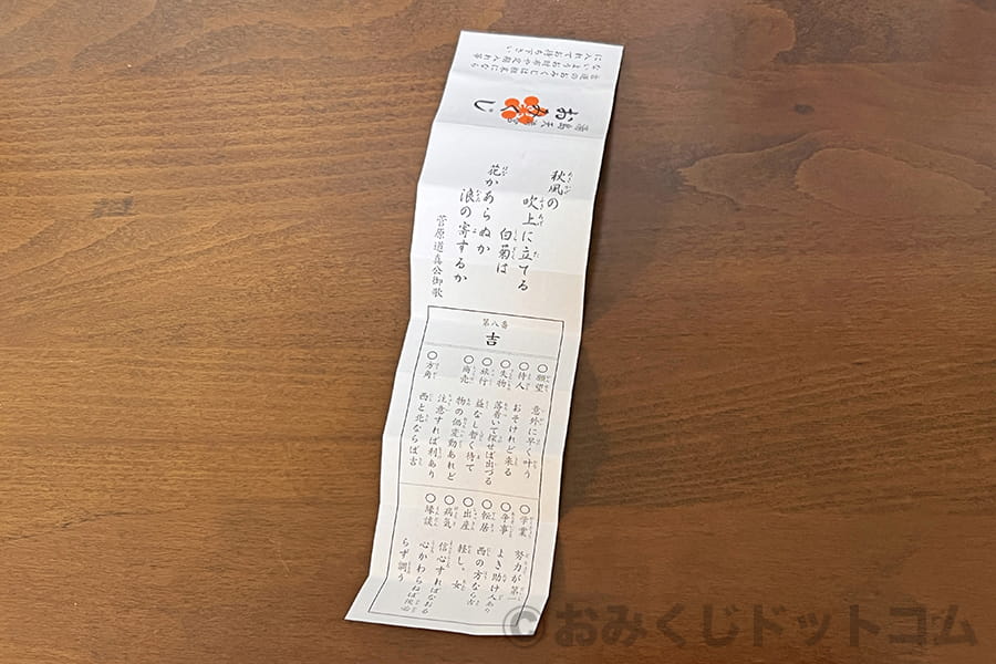 おみくじを広げると、よくある一般的な縦長短冊形のおみくじであり、上部に祭神の御神意の書かれた和歌(菅原道真公御歌)、中央に吉凶の運勢、下部に個別の運勢を見る部分に分かれています。