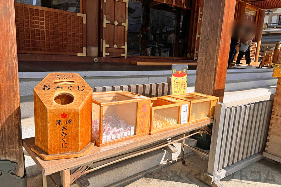 ※湯島天神 拝殿・本殿前、賽銭箱横にある各種おみくじの様子|画像提供:おみくじドットコム