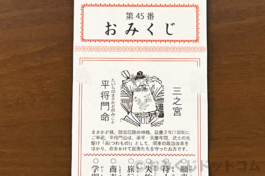 おみくじには珍しい、神田明神三之宮に祀られている平将門命が描かれ紹介されています。