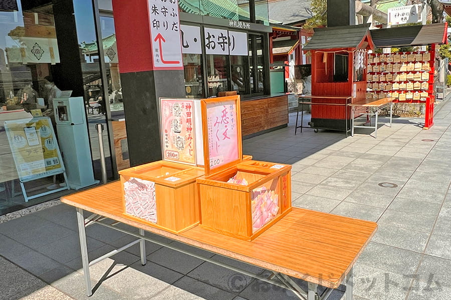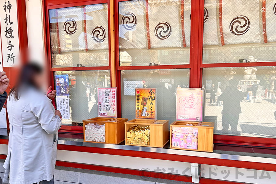 ※神田明神 社務所の神札授与所横にある各種おみくじの様子|画像提供:おみくじドットコム