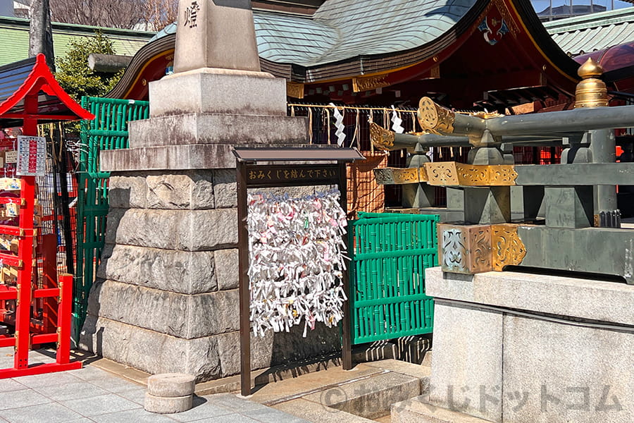 ※神田明神 拝殿・本殿左手のところにあるおみくじ掛け(おみくじ納所)の様子|画像提供:おみくじドットコム