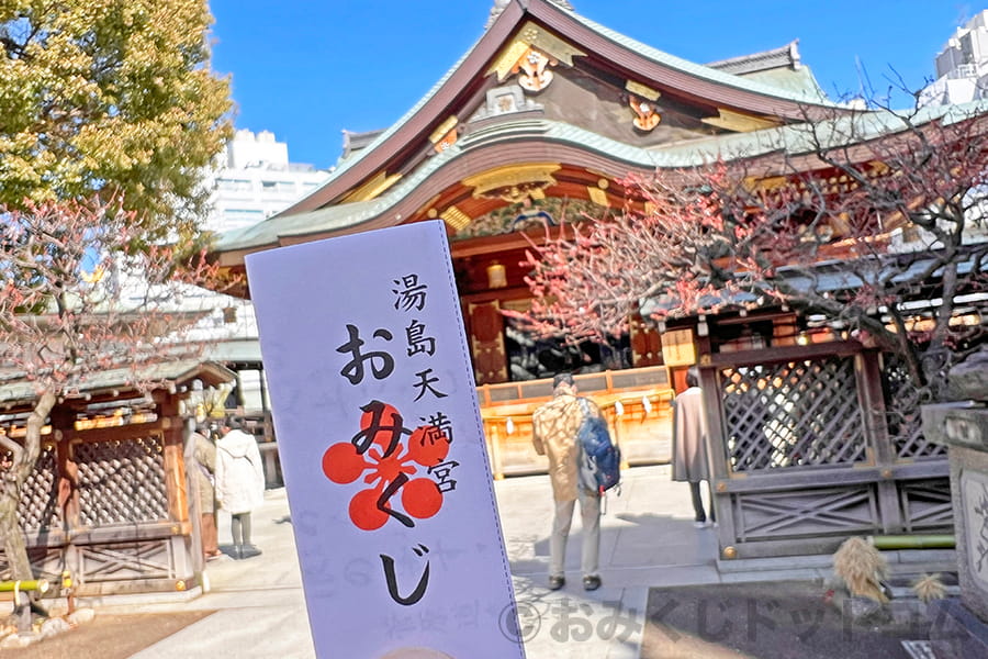 ※湯島天神 実際の湯島天神で引いたおみくじと背景の拝殿・本殿の様子|画像提供:おみくじドットコム